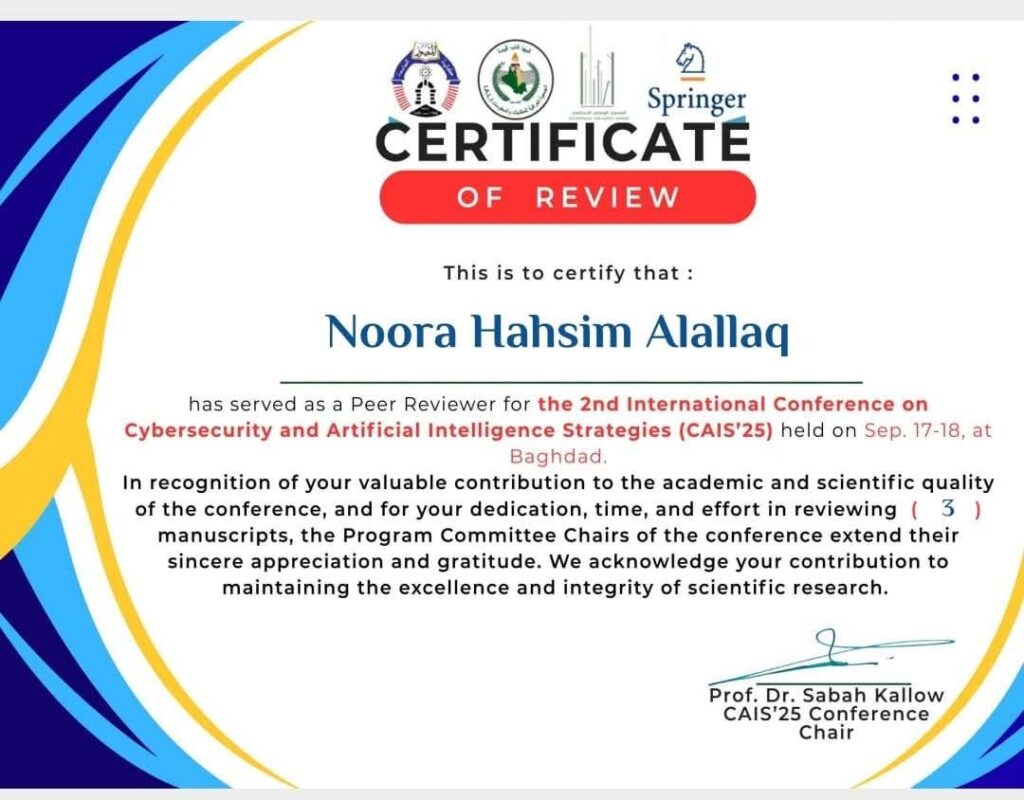 تتقدّم عمادة كلية الحاسبات والمعلوماتية بأسمى آيات التهاني والتبريكات إلى معاون عميد الكلية للشؤون العلمية، المدرس الدكتورة نورا هاشم محمد، بمناسبة حصولها على شهادة تقديرية لقيامها بتقييم بحث علمي بصفتها مراجِعة علمية (Peer Reviewer) ضمن المؤتمر الدولي الثاني لاستراتيجيات الأمن السيبراني والذكاء الاصطناعي (CAIS’25)، الذي أُقيم في جامعة المنصور ببغداد.