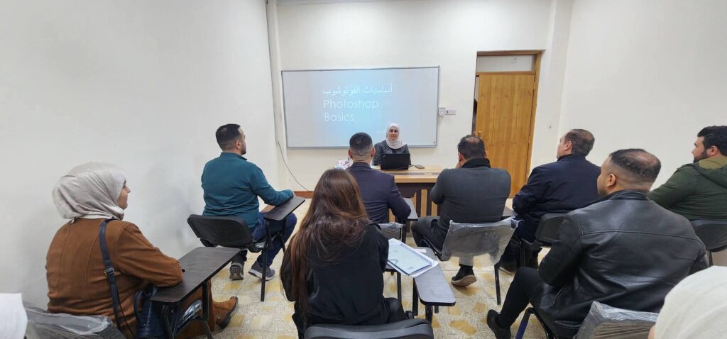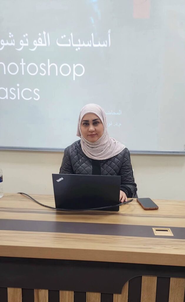 The first day of the course featured a lecture delivered by Lecturer Dr. Nora Hashim Mohammed, in which she covered the basics of Adobe Photoshop. She introduced the program’s main interface and essential tools, in addition to explaining the fundamentals of image handling and editing, contributing to the participants’ acquisition of practical skills in design and image processing.
