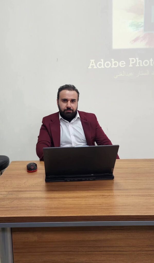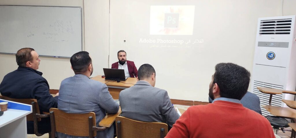 The fourth day of the course featured a lecture delivered by Assistant Lecturer Mohammed Abdul Sattar Abdulghani entitled “Effects and Filters,” in which he provided a practical explanation of the most important effects and filters in Photoshop and demonstrated how to use them to improve design quality and add professional touches, contributing to the development of participants’ skills and enabling them to produce advanced design work.