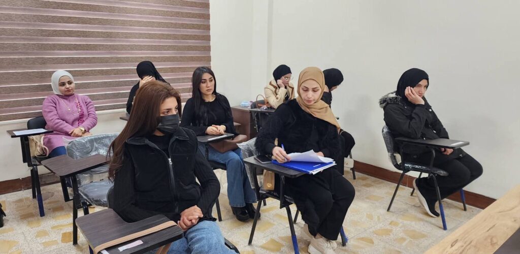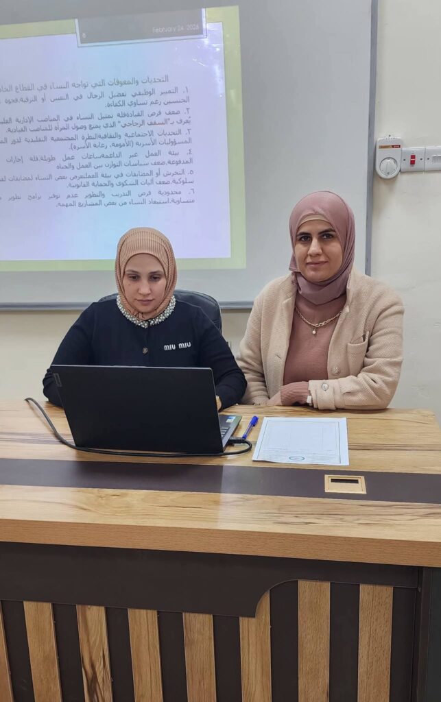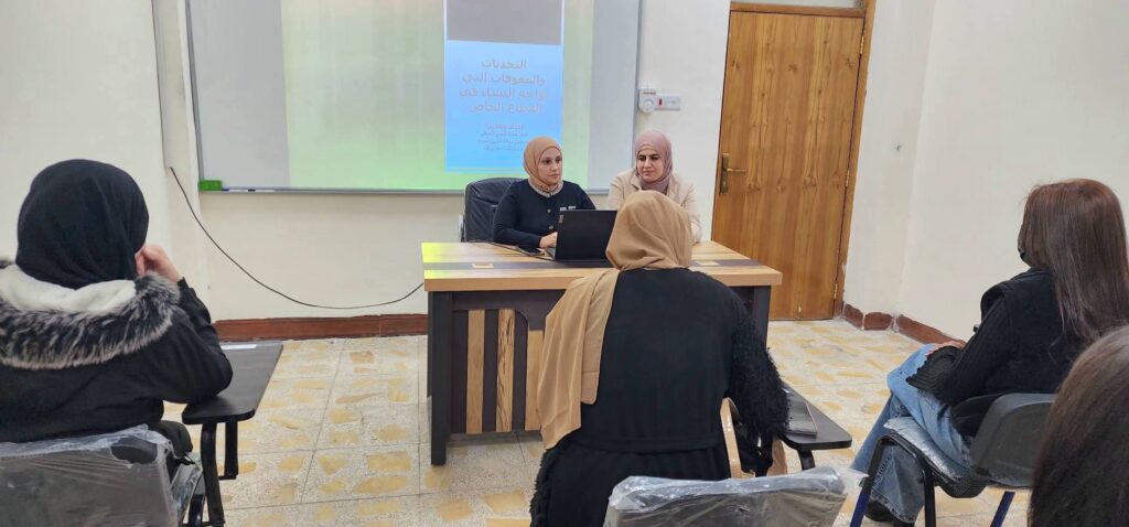 The workshop was delivered by Assistant Lecturer Khalida Qusai Sabah, along with Assistant Lecturer Elaf Ahmed Radif. They addressed the most prominent challenges hindering women’s participation in the private sector work environment, including social and professional obstacles, disparities in employment opportunities, and mechanisms for fostering a supportive work environment that ensures justice and equality.